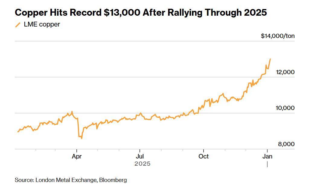 国际铜价在首次突破每吨13000美元后延续强劲涨势,新一轮向美国运铜的热潮,让交易商与投资者的多头情绪愈发高涨。此外,在供应担忧加剧的背景下,市场预期委内瑞拉的动荡也可能加速对关键矿产的争夺。
