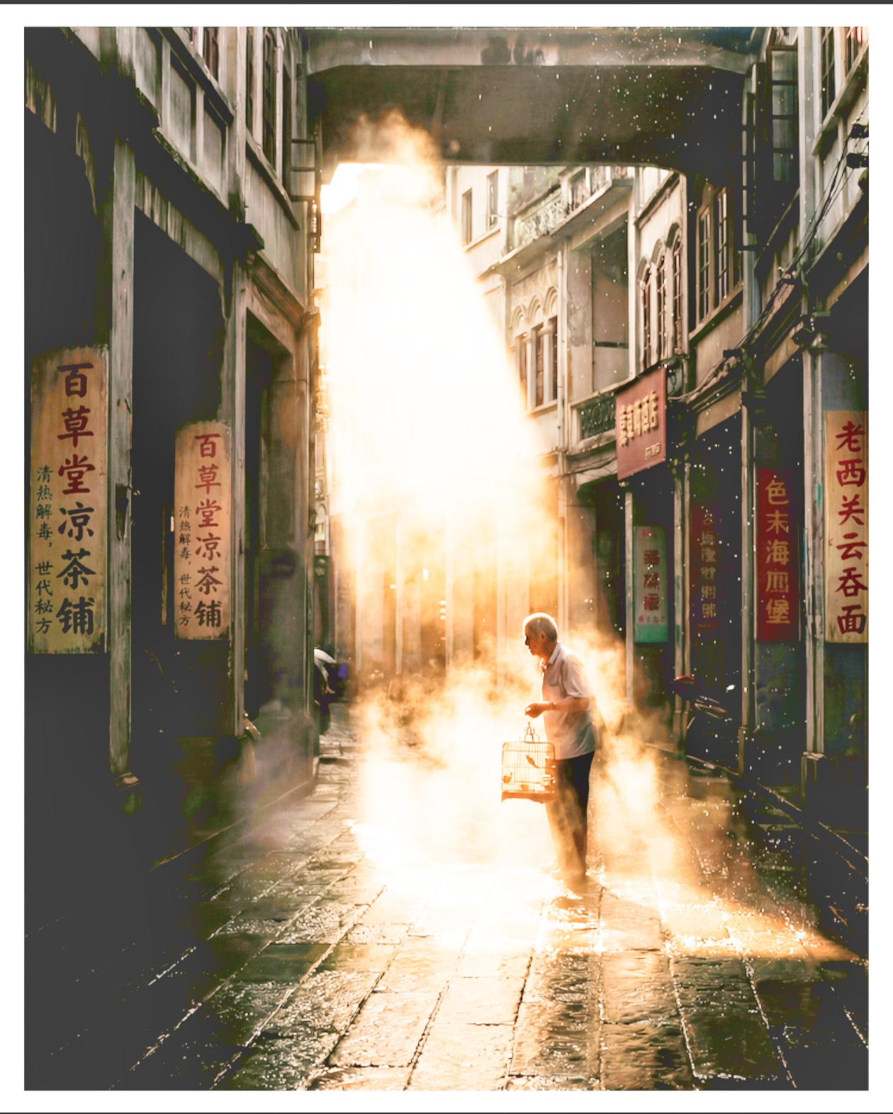 根据该网友所说,记者找到第42号作品《骑楼旧光》原图,将亮度调大并将曝光调到过量曝光东信证券,明显看到图片右侧的数个牌匾出现字体错乱和字体生成不全。该网友称,这是Al生成图片的常见错误,一眼就可辨别图片是AI生成的。还有其他例如老人提鸟笼的手指跟手掌连不起来、左侧连续两个凉茶铺牌匾之类的露馅细节。