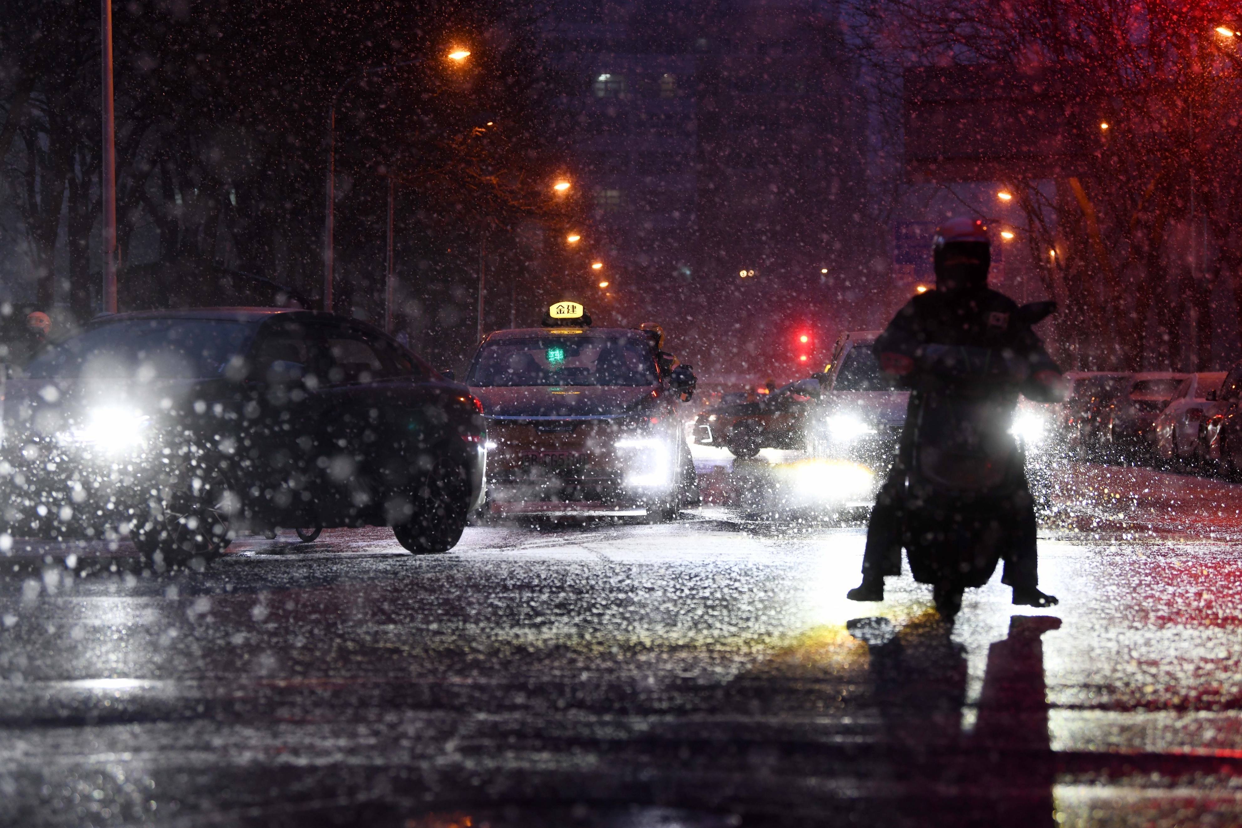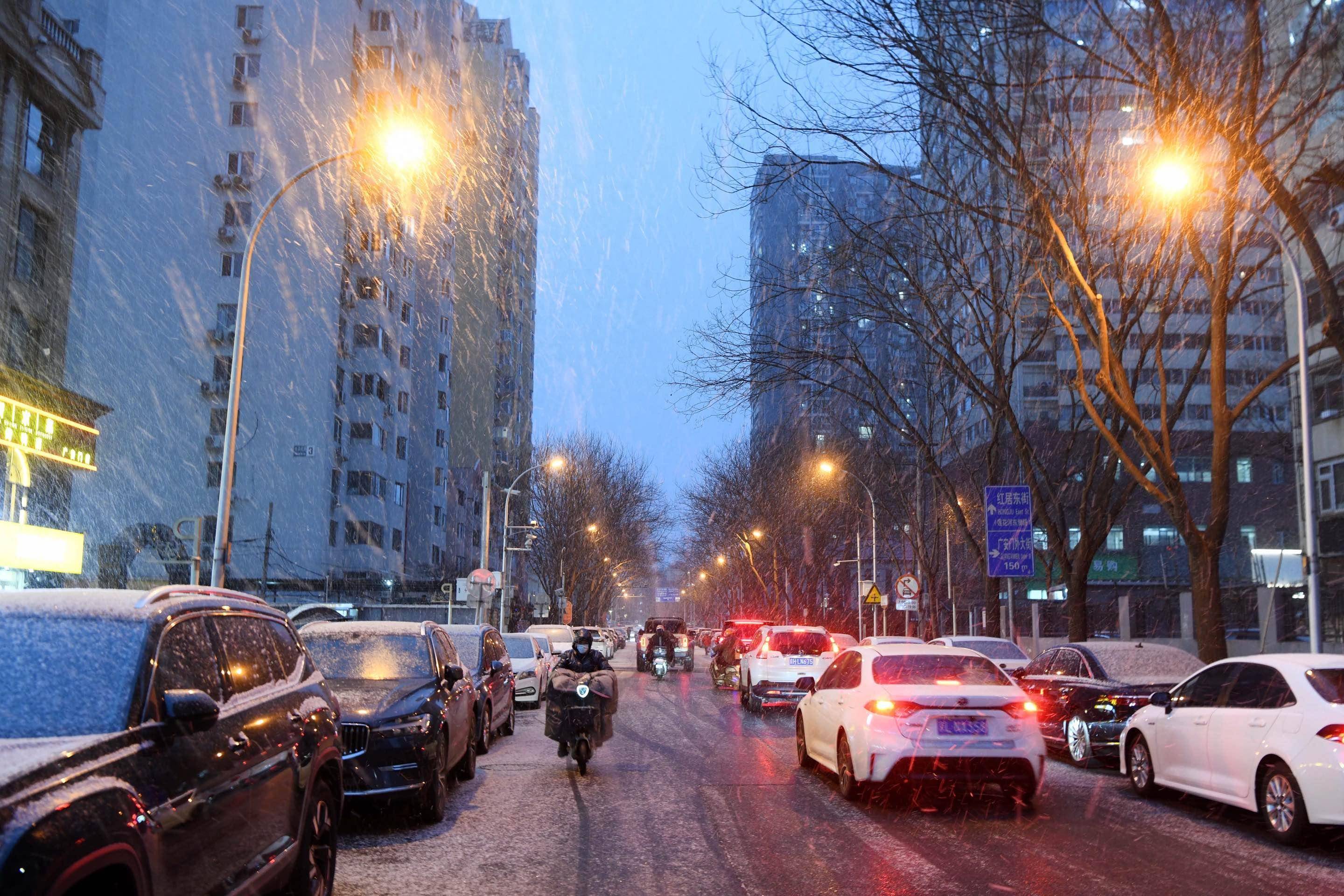 暮色四合的西城区红居东街,街灯晕开暖黄的光晕,纷扬的雪花簌簌落下,将街巷晕染成一幅静谧的冬日画卷。归家的车流缓缓前行,骑行者裹紧衣物穿梭在风雪中,雪粒落满车窗与车顶,为寒冷的冬日增添了别样氛围感,也给归家之路蒙上一层温柔滤镜。